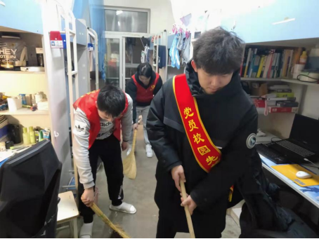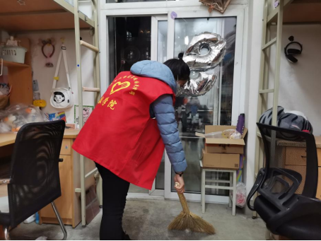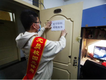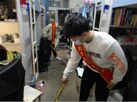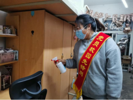 党员先锋队志愿者开展消毒工作的同时,按照分工对寝室同学进行一对一服务,宣传疫情防控知识,提醒同学们注意保持室内环境卫生和室内通风,引导同学们做好个人卫生防护。