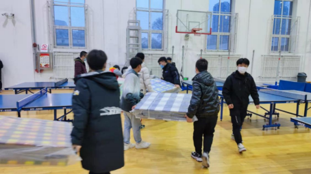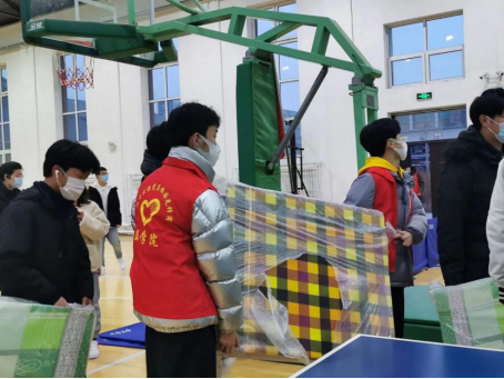 3月18日下午5:40,志愿者们抵达体育馆。在学校相关人员指挥领导下,志愿者们迅速有序地将折叠床及被褥等物资搬运至体育馆指定地点处。天气虽寒,但仍挡不住志愿者们无私奉献的火热之心。在疫情防控这场“大战”、“大考”面前,青年志愿者们主动请缨,助力疫情防控。感谢每一个身穿红马甲认真工作的志愿者们,感恩每一个奋战且可爱可敬的你们。