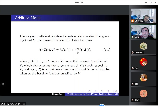 在校园封闭管理期间,为了给学生提供更多的学习资源,提高疫情期间在校学习热情,我院邀请到中国科学院数学与系统科学研究院二级研究员、《数理统计与管理》主编,以及《统计与决策》、Journal of Systems Science and Complexity、Statistics and Its Interface、Journal of Biometrics & Biostatistics等期刊的编委孙六全教授于4月11日19:30时在腾讯会议做题为《Variable Screening for Several Varying Coefficient Models with Ultrahigh-Dimensional Survival Data》的报告。