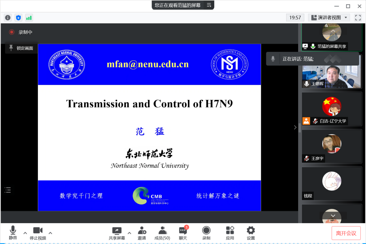 2022年4月16日上午辽宁大学yl9193永利集团有幸邀请到生物数学方向的知名专家东北师范大学范猛教授,为大家作了具有前沿性和时代性的专题报告:“Transmission dynamics and optimal control of H7N9”(H7N9的传播动力学与最优控制)。