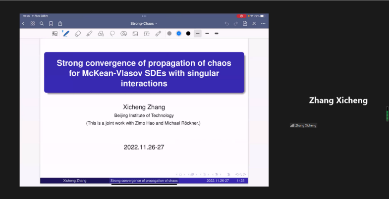 首节报告由美国杜克大学Jian-Guo Liu教授主持。英国牛津大学Jose A. Carrillo教授作题为《Nonlocal Aggregation-Diffusion Equations: entropies, gradient flows, phase transitions and applications》的报告;北京理工大学张希承教授作题为《Strong convergence of McKean-Vlasov SDEs with singular interactions》的报告。