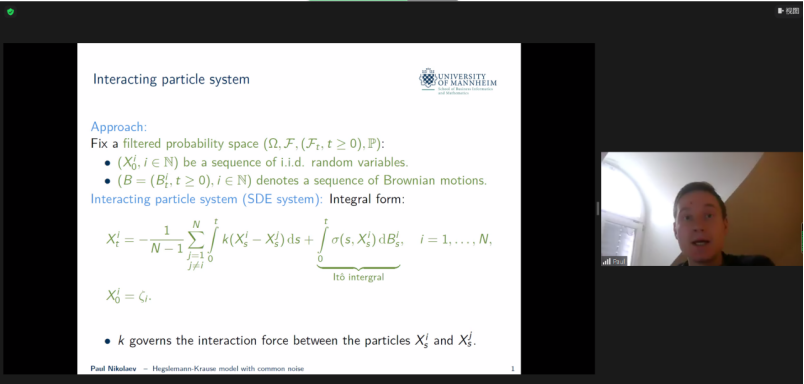 第二节报告由来自德国曼海姆大学的Li Chen教授主持。上海交通大学李磊教授作题为《Fluctuation suppression and enhancement in interacting particle systems》的报告;德国曼海姆大学Paul Nikolaev博士作题为《Hegselmann-Krause model with environmental noise》的报告。