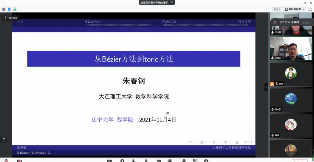 大连理工大学朱春钢教授,博士生导师,计算科学研究所所长。现任中国工业与应用数学学会常务理事,中国计算机学会计算机辅助设计与图形学专委会委员,中国工业与应用数学学会几何设计与计算专委会委员,中国数学会计算机数学专委会委员,辽宁省计算数学与数据智能重点实验室副主任。主要从事计算几何与计算机辅助几何设计方向的研究工作,在ACM TOG、CAGD、CAD、CGF等期刊发表论文多篇,出版教材2部,主持多项国家自然科学基金项目。本次学术会议报告的题目为《从Bezier方法到toric方法》,朱春钢教授从Bezier曲线的由来、发展、Bezier曲线与本科课程《数值分析选讲》中的Bernstein多项式之间的联系以及计算图像学中Bezier方法到toric方法的发展等未来的发展方面详细地做了讲解。报告结束后,数学院的师生与朱春钢教授进行了交流和探讨。