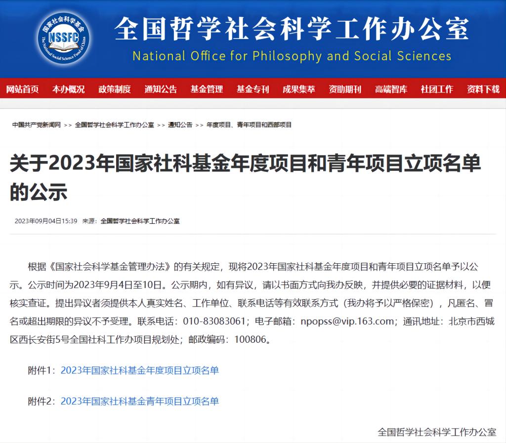 9月4日,全国哲学社会科学工作办公室公布了“2023年国家社科基金年度项目和青年项目立项名单的公示”。