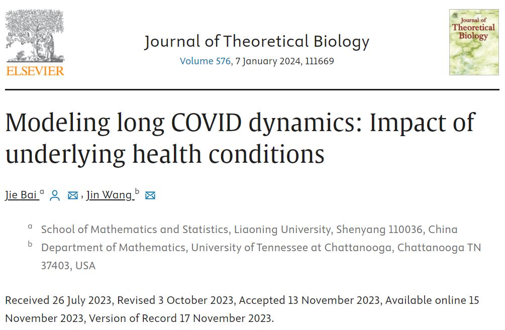 yl9193永利集团白洁讲师作为第一作者和通讯作者与美国田纳西大学J. Wang教授合作完成的论文“Modeling Long COVID Dynamics: Impact of Underlying Health Conditions”在生物数学主流期刊《Journal of Theoretical Biology》2024年第576卷发表。