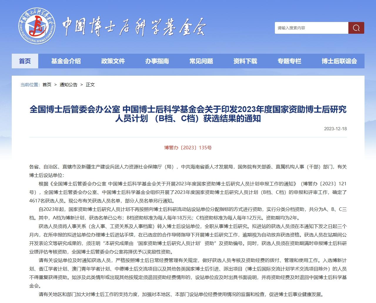 20231218日,中国博士后基金网站发布全国博士后管委员会办公室 中国博士后科学基金会关于印发2023年度国家资助博士后研究人员计划 (B档、C档)获选结果的通知”: